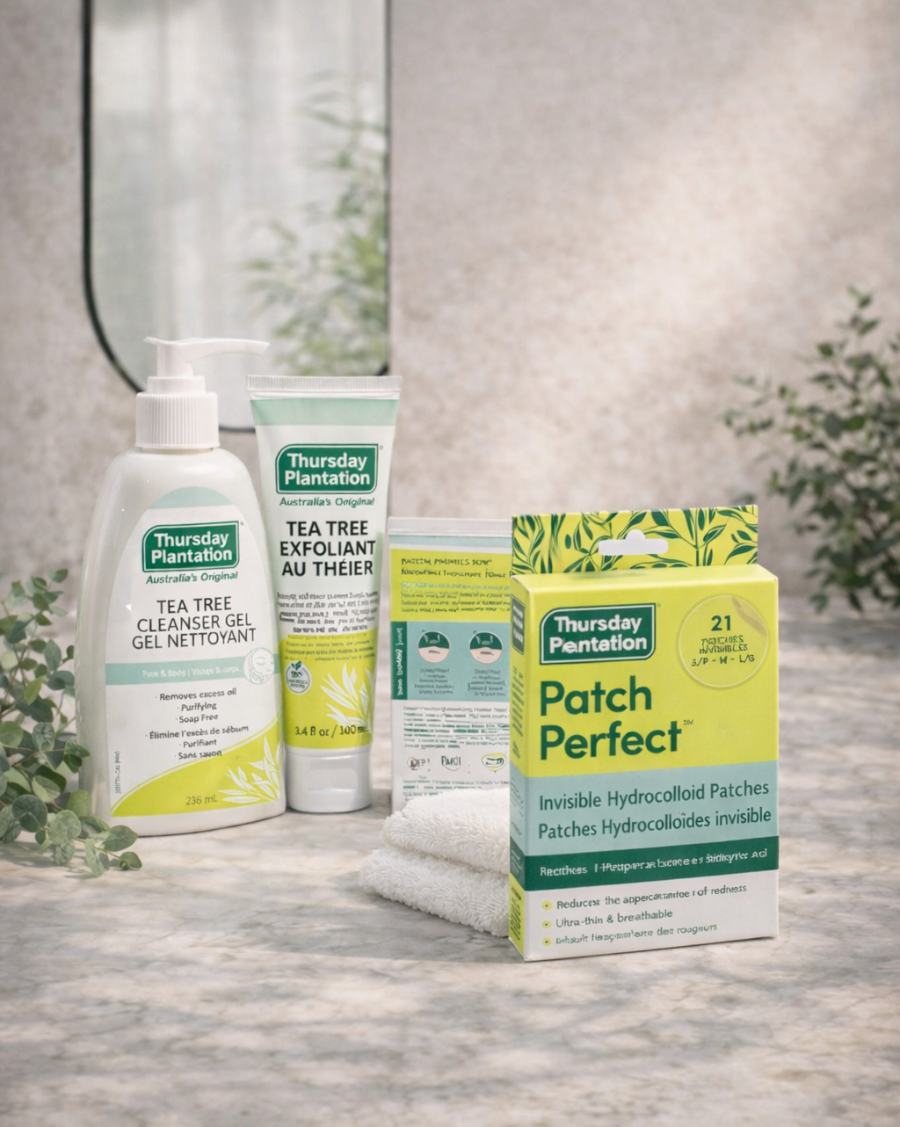 Fresh, effective, and ready to refresh — meet the Tea Tree Gel Cleanser, Patch Perfect™ Hydrocolloid Patches, and Tea Tree Exfoliant. The perfect combination for naturally clear, refreshed, and radiant skin.